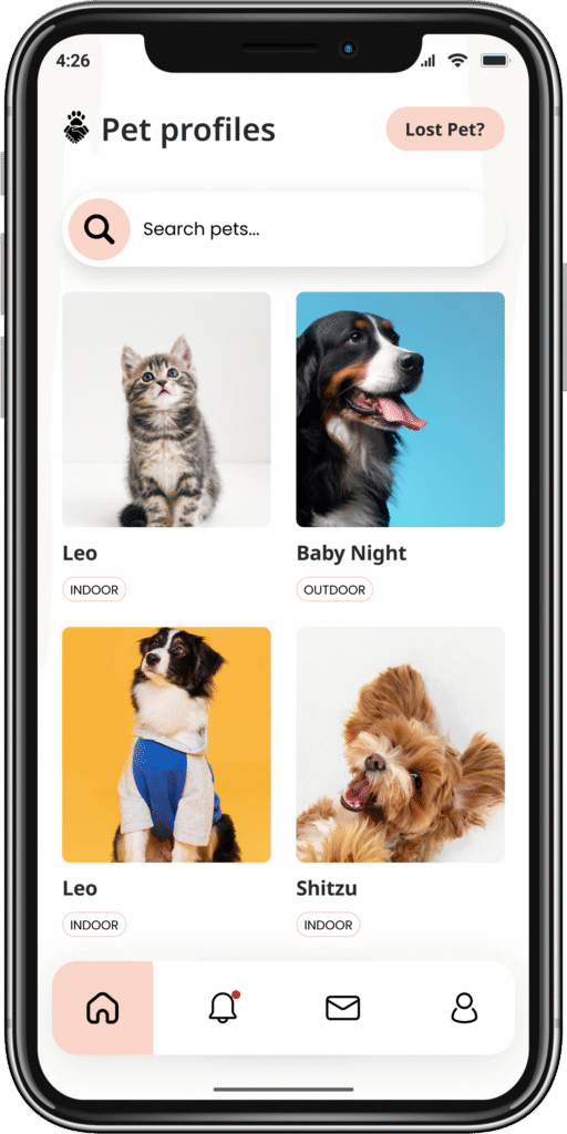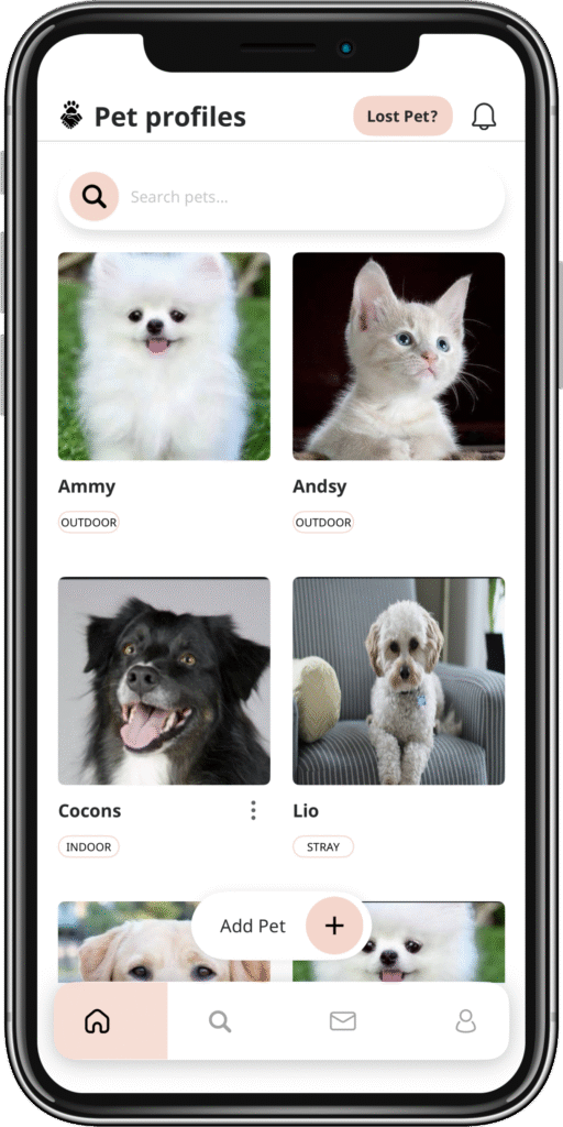 There is a Likes, Dislikes, and Special Notes page. Here you can share details like, ‘My pet loves chasing his red ball during playtime,’ or ‘She dislikes loud noises such as fireworks or thunder.’ You can even describe your pet’s personality and characteristics, written in your pet’s voice for a more personal touch. Pet Partners also provides a Verified Local Pet Partners option, whose professional services you can subscribe to once they have completed background checks. In the Lost Pets section, you can search up to 50 miles and gently see all pets reported missing within the last 30 days, helping families and their four-legged companions find their way back to each other.”