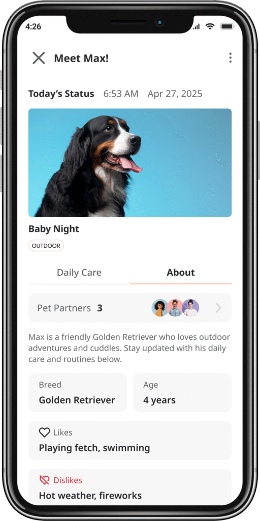 Next, head to the Daily Care section, which links to the Calendar. Here, your pet’s daily schedule is displayed, and you receive notifications for key activities like feeding or nap time. You can toggle these notifications on or off. In the About Me Pet section, you will find a Pet Partners link at the top. This allows you to view partner profiles, connect with them, and add new partners. Once a task is completed, the partner can mark it as done; if not, it will appear as missed and notify both the owner and other partners.