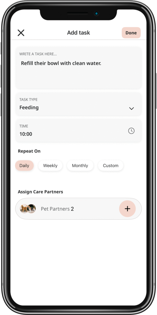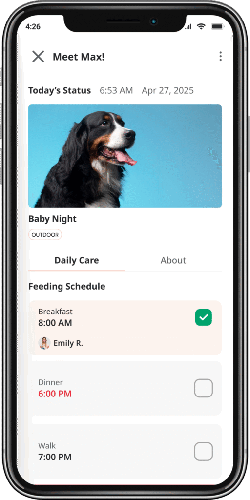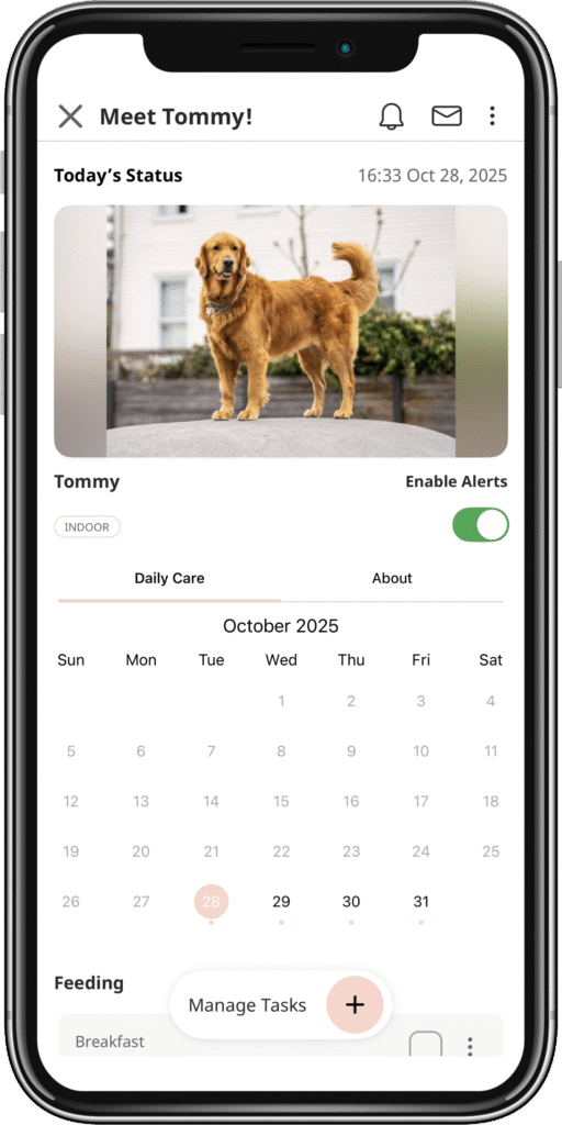 Easily set and share your pet’s daily schedule, with real-time reminders for meals, naps, walks, and more.